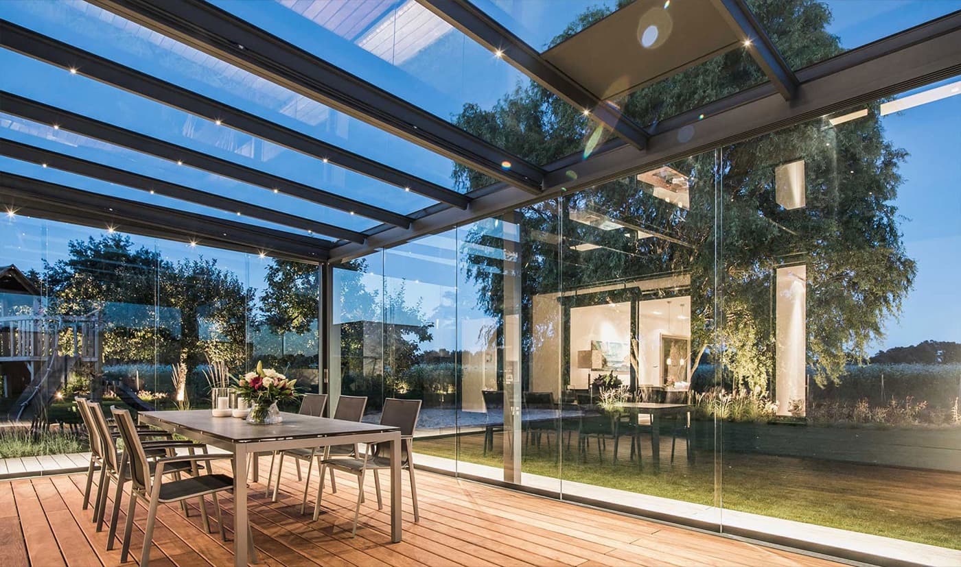Functions as a standalone structure or seamless extension to a home, restaurant, or hotel. Tempered and energy-efficient glass from Guardian, AGS, and Pilkington — with various levels of solar control and heat retention.